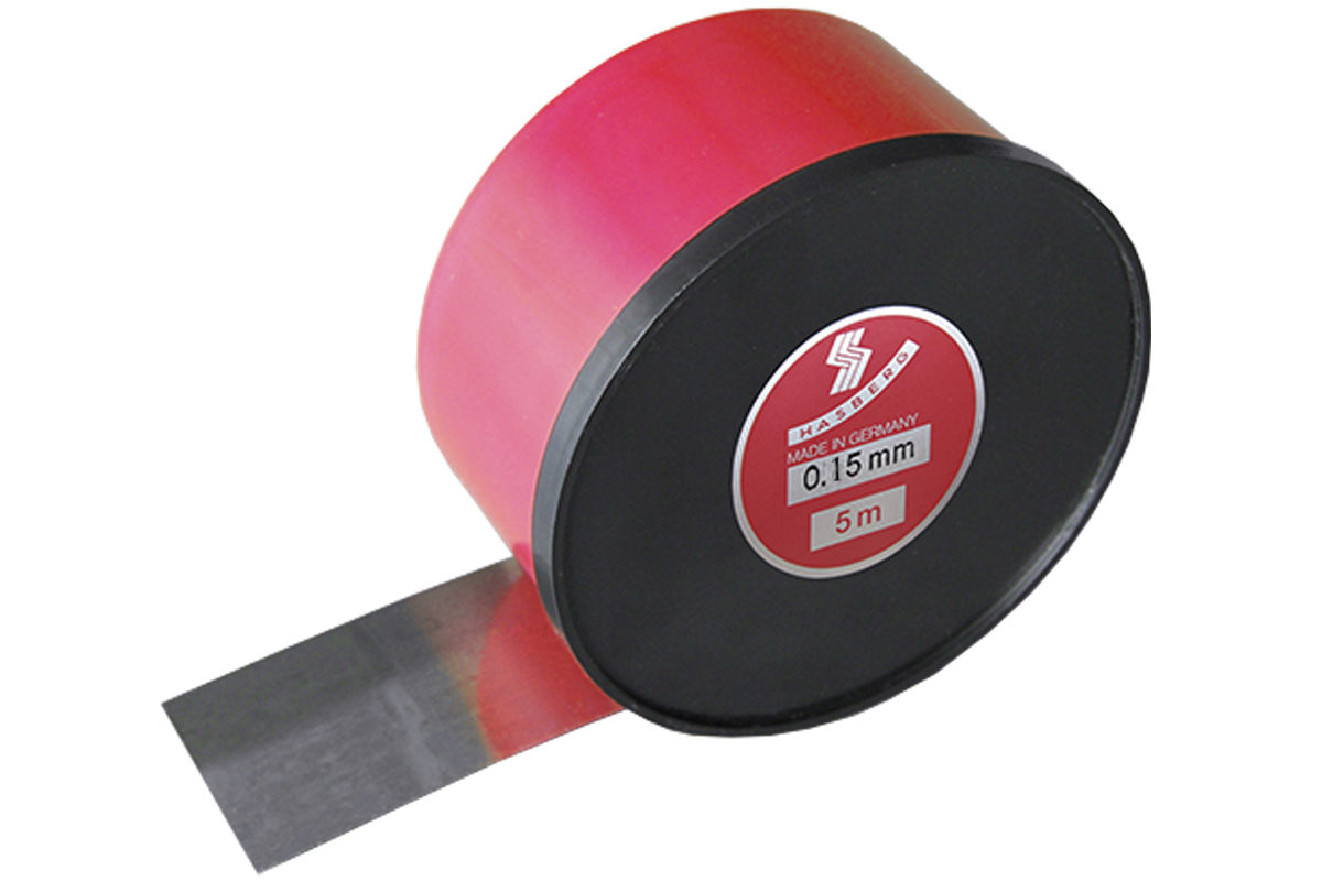 Erikoisohut tarkkuusnauha putken suoran leikkauslinjan merkitsemiseen, nauhan paksuus 0,15mm, materiaali ruostumaton teräs, pakattuna metallipurkissa